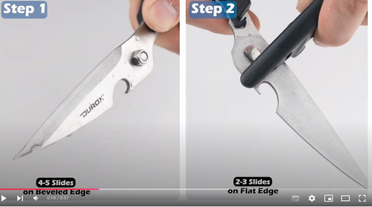3. Use the sharpener to sharpen the blade's beveled edge: make 3-5 slides on the beveled edge and 2-3 slides on the flat edge to remove any burr.