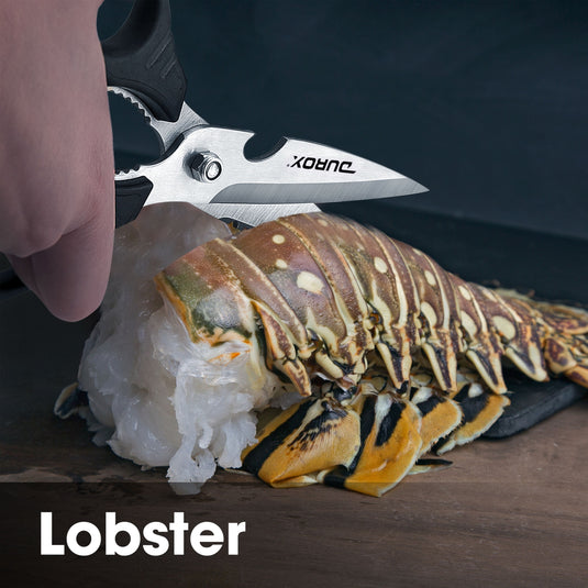 Yes, there is a notch near the base of the blade specifically designed to cut through lobster, shrimp, or crab shells.