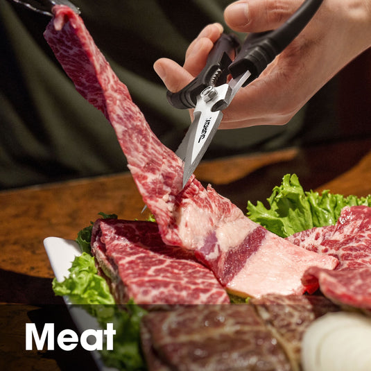 You can cut raw meat with these scissors, but not poultry bones. If you need scissors for cutting chicken or fish bones, we recommend checking out our heavy-duty scissors.