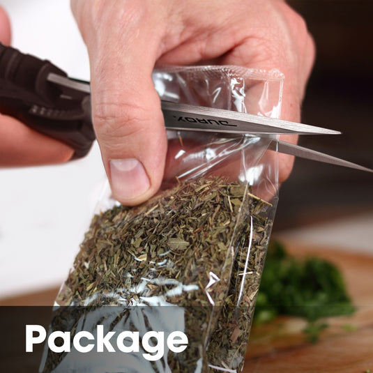 These kitchen shears are quite handy. They cut through packages easily and handle various kitchen tasks well. The protective cover with a sharpener is a nice touch, ensuring safe storage and keeping them ready for use.