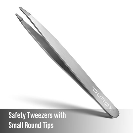 Designed with small round tips, these safety tweezers gently remove chin hair without scratching and shape brows without the risk of overplucking.